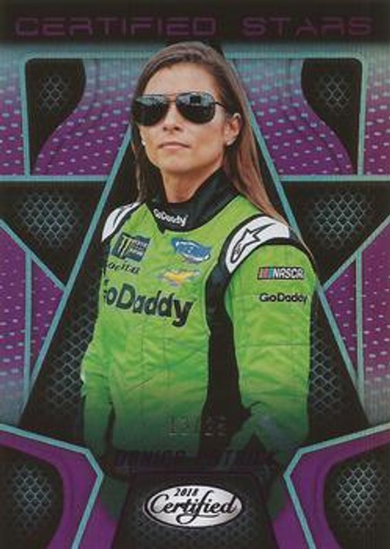 The Danica Patrick 2018 Certified NASCAR #CS6 Certified Stars - Purple /25 card is 1 of 78 Danica Patrick's card variations in the 2018 Certified NASCAR set being tracked by Sports Card Investor, including #72 Base /149, #95 Base /149, #72 Orange /249, #95 Orange /249, and #72 Mirror Gold /25.