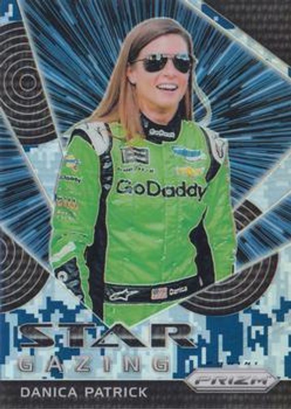 The Danica Patrick 2018 Prizm NASCAR #67 Camo card is 1 of 95 Danica Patrick's card variations in the 2018 Prizm NASCAR set being tracked by Sports Card Investor, including #85 Base, #75 Base, #67 Base, #52 Base, and #15 Base.