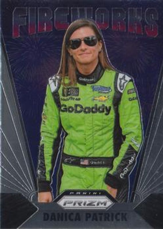 The Danica Patrick 2020 Prizm NASCAR #F8 Fireworks card is 1 of 37 Danica Patrick's card variations in the 2020 Prizm NASCAR set being tracked by Sports Card Investor, including Base, Blue, Blue & Carolina Blue Hyper, Green & Yellow Hyper, and Red.