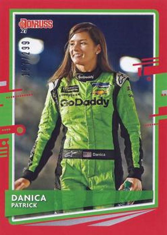The Danica Patrick 2021 Donruss NASCAR #115 Red /299 card is 1 of 73 Danica Patrick's card variations in the 2021 Donruss NASCAR set being tracked by Sports Card Investor, including #115 Base, #166 Base, #115 Carolina Blue, #166 Carolina Blue, and #115 Orange.