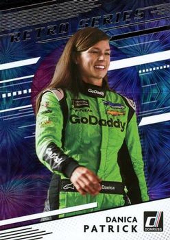 The Danica Patrick 2021 Donruss NASCAR #RS2 Retro Series card is 1 of 73 Danica Patrick's card variations in the 2021 Donruss NASCAR set being tracked by Sports Card Investor, including #115 Base, #166 Base, #115 Carolina Blue, #166 Carolina Blue, and #115 Orange.