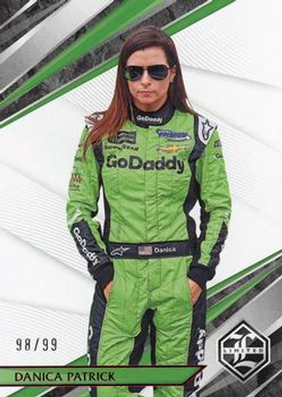 The Danica Patrick 2022 Chronicles NASCAR #14 Limited Red /99 card is 1 of 76 Danica Patrick's card variations in the 2022 Chronicles NASCAR set being tracked by Sports Card Investor, including Absolute, Absolute Autographs, Clearly Donruss, Clear Vision, and Limited.