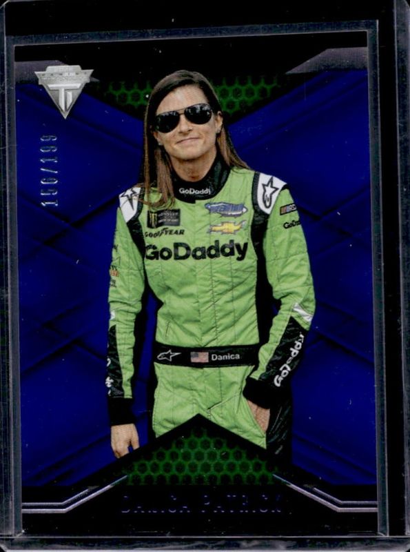 The Danica Patrick 2022 Chronicles NASCAR #8 Titanium Blue /199 card is 1 of 76 Danica Patrick's card variations in the 2022 Chronicles NASCAR set being tracked by Sports Card Investor, including Absolute, Absolute Autographs, Clearly Donruss, Clear Vision, and Limited.