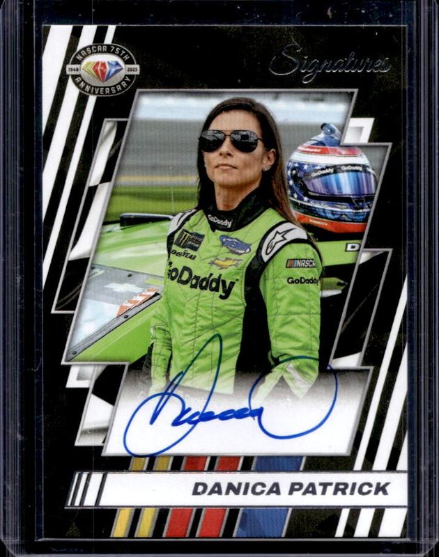 The Danica Patrick 2023 Donruss NASCAR #75-DP NASCAR 75th Anniversary Signatures card is 1 of 67 Danica Patrick's card variations in the 2023 Donruss NASCAR set being tracked by Sports Card Investor, including #176 Base, #91 Base, #176 Carolina Blue, #91 Carolina Blue, and #176 Lime Green.