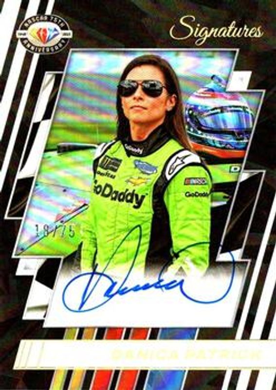 The Danica Patrick 2023 Donruss NASCAR #75-DP NASCAR 75th Anniversary Signatures Holo /75 card is 1 of 67 Danica Patrick's card variations in the 2023 Donruss NASCAR set being tracked by Sports Card Investor, including #176 Base, #91 Base, #176 Carolina Blue, #91 Carolina Blue, and #176 Lime Green.