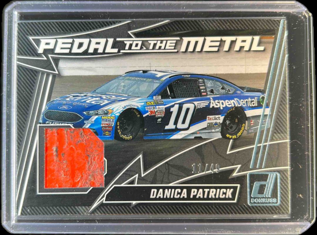 The Danica Patrick 2025 Donruss NASCAR #PM-DPK Pedal to the Metal Materials - Blue /49 card is 1 of 16 Danica Patrick's card variations in the 2025 Donruss NASCAR set being tracked by Sports Card Investor, including Pedal to the Metal Materials, Pedal to the Metal Materials - Blue Ice, Pedal to the Metal Materials - Orange Ice, Signatures Series, and Signatures Series - Blue Ice.