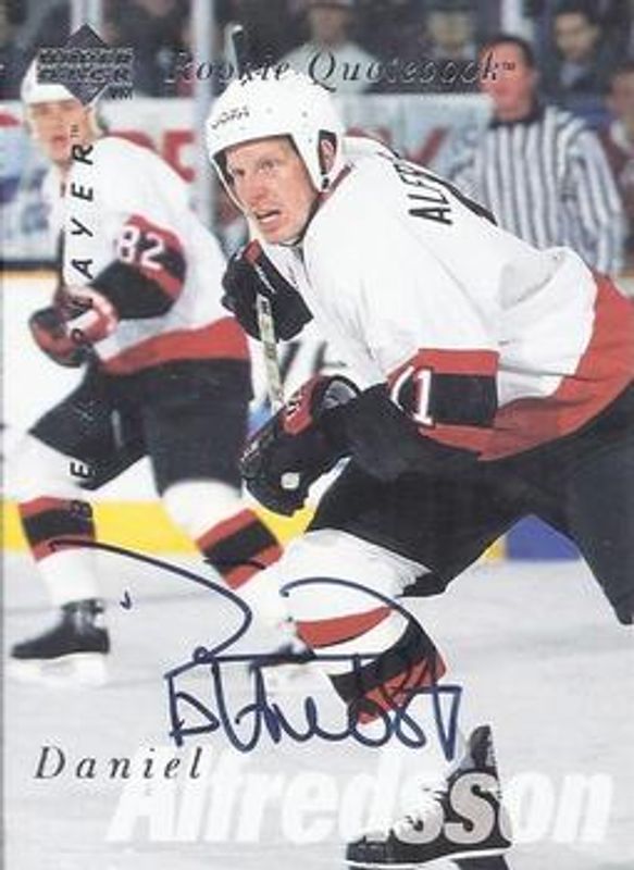 The Daniel Alfredsson 1995 Upper Deck Be a Player #S171 Autographs Rookie card is 1 of 4 Daniel Alfredsson's card variations in the 1995 Upper Deck Be a Player set being tracked by Sports Card Investor, including Base, Autographs die-cut, and Lethal Lines.