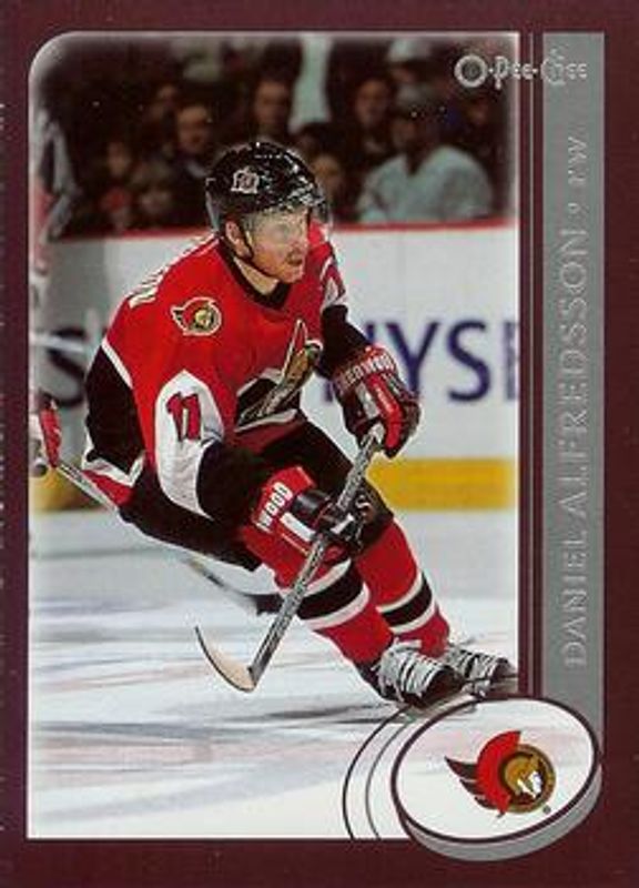 The Daniel Alfredsson 2002 O-Pee-Chee #23 Base card is 1 of 7 Daniel Alfredsson's card variations in the 2002 O-Pee-Chee set being tracked by Sports Card Investor, including Factory Set, Factory Set Hometown Heroes Canada, O-Pee-Chee Premier Blue Line /500, O-Pee-Chee Premier Red Line /100, and Box Toppers 3x5.