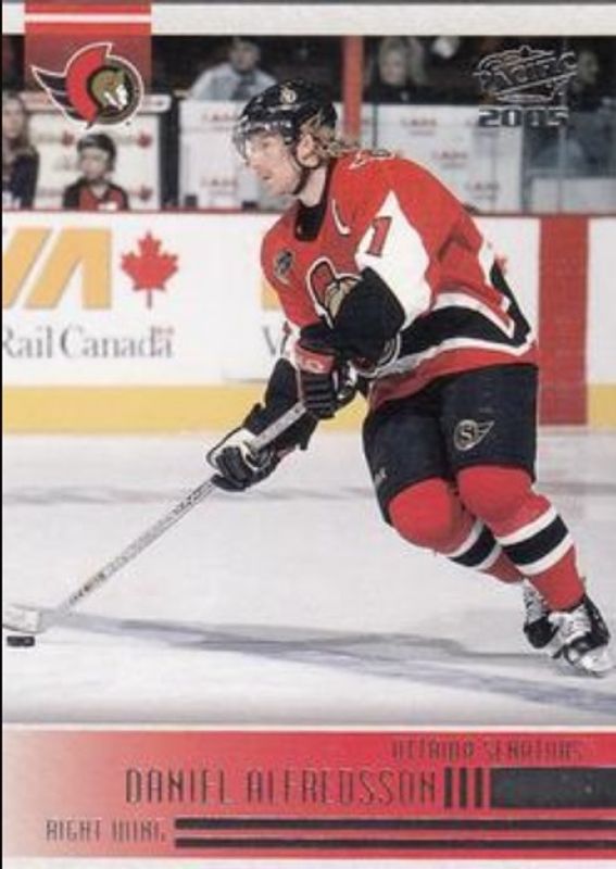 The Daniel Alfredsson 2004 Pacific #181 Base card is 1 of 5 Daniel Alfredsson's card variations in the 2004 Pacific set being tracked by Sports Card Investor, including Red, Blue /250, Jerseys /850, and Jerseys - Gold /50.