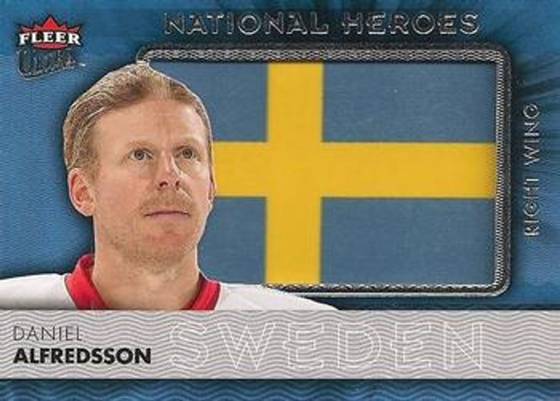 The Daniel Alfredsson 2014 Fleer Ultra #NH-DA National Heroes card is 1 of 5 Daniel Alfredsson's card variations in the 2014 Fleer Ultra set being tracked by Sports Card Investor, including Base, Gold Medallion, Platinum Medallion /25, and Violet /1.