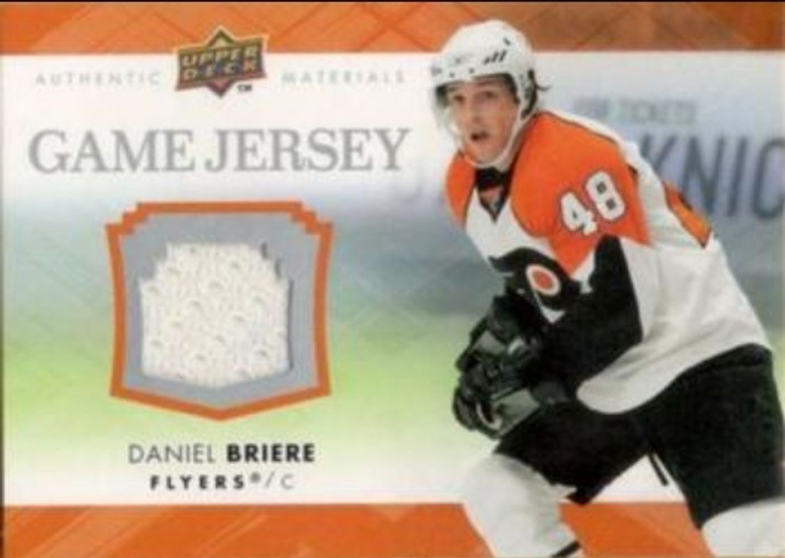 The Daniel Briere 2007 Upper Deck #GJ2-DB Game Jerseys card is 1 of 17 Daniel Briere's card variations in the 2007 Upper Deck set being tracked by Sports Card Investor, including Base, UD Exclusives /100, UD High Gloss /10, Printing Plates Black /1, and Printing Plates Cyan /1.