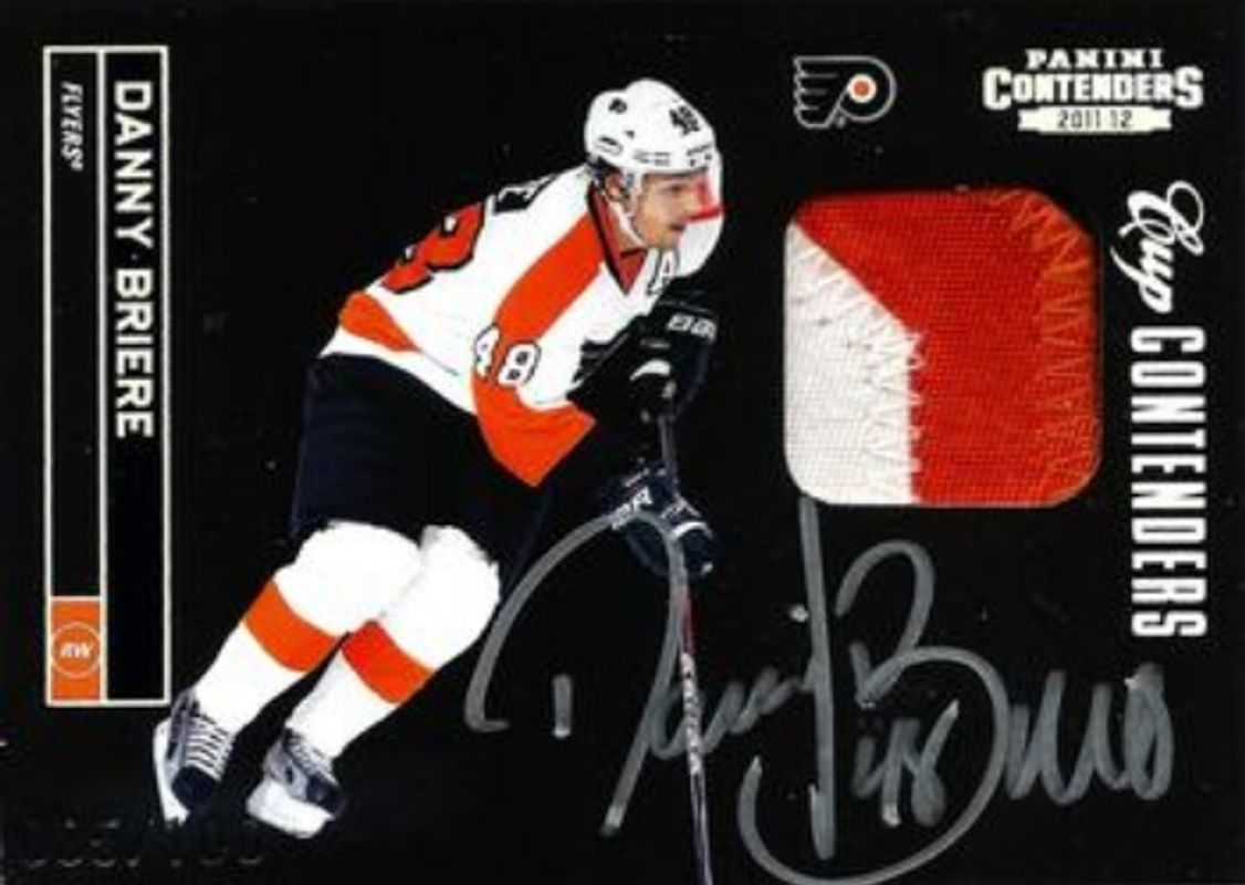 The Daniel Briere 2011 Contenders #122 Signatures Patch /100 card is 1 of 13 Daniel Briere's card variations in the 2011 Contenders set being tracked by Sports Card Investor, including #122 Base /800, #48 Gold /100, #48 Black /1, #122 Printing Plate Black /1, and #48 Printing Plate Black /1.