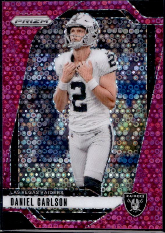 The Daniel Carlson 2024 Prizm #153 No Huddle Pink /25 card is 1 of 83 Daniel Carlson's card variations in the 2024 Prizm set being tracked by Sports Card Investor, including Base, Choice Blue Yellow Green, Choice Silver, Disco, and Green.
