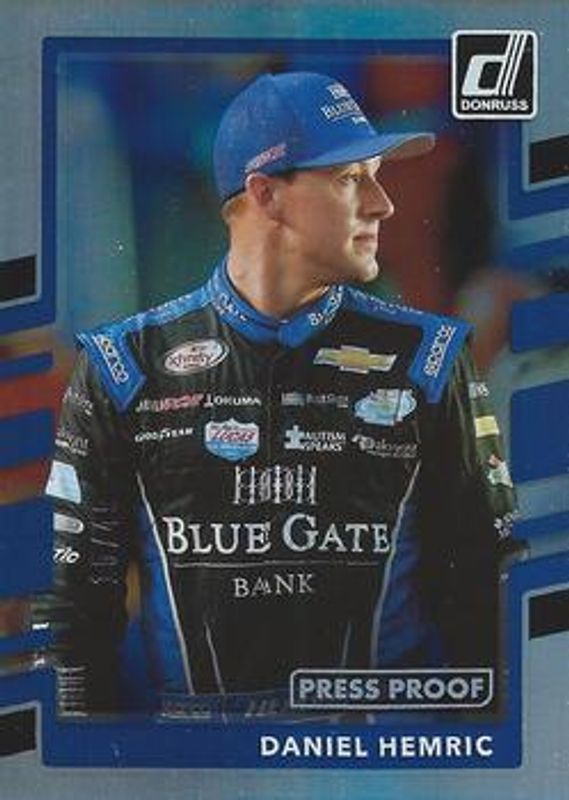 The Daniel Hemric 2018 Donruss NASCAR #74 Press Proof Holofoil /49 card is 1 of 18 Daniel Hemric's card variations in the 2018 Donruss NASCAR set being tracked by Sports Card Investor, including Base, Gold Foil /499, Red Foil /299, Green Foil /199, and Press Proof Gold /99.