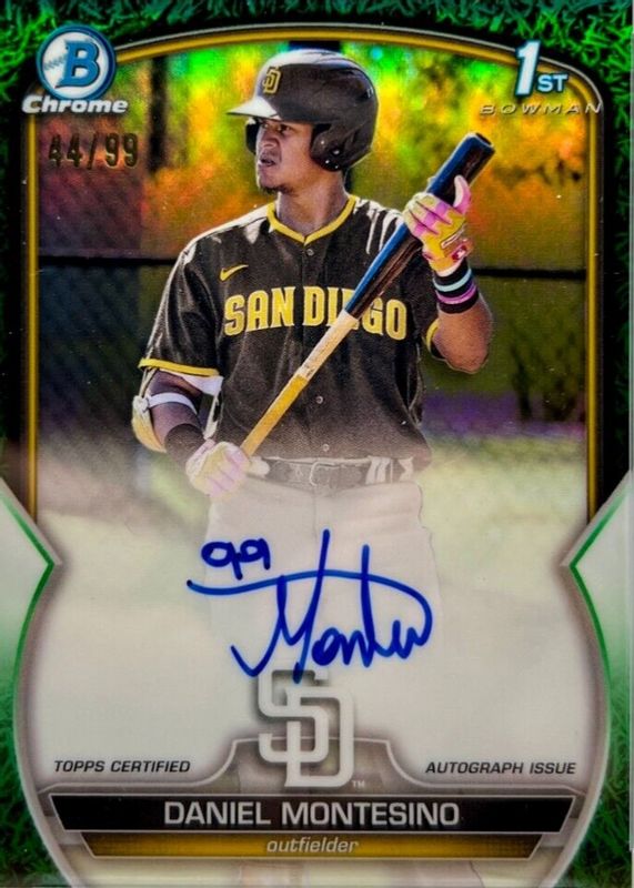 Best Prices Available For Sale of Daniel Montesino 2023 Bowman #CPA-DM Chrome Prospect Auto - Green Grass Refractor /99 (1st)