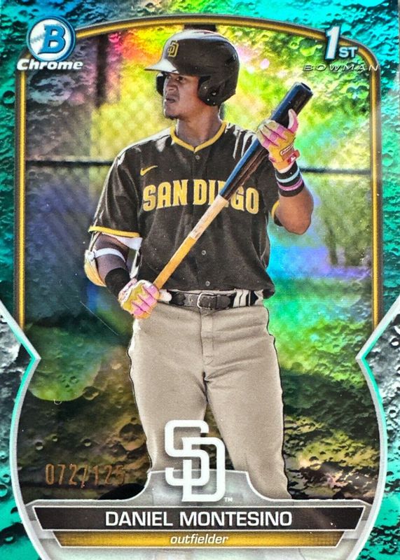 Best Prices Available For Sale of Daniel Montesino 2023 Bowman #BCP-114 Chrome Prospects - Aqua Lunar Crater Refractor /125 (1st)