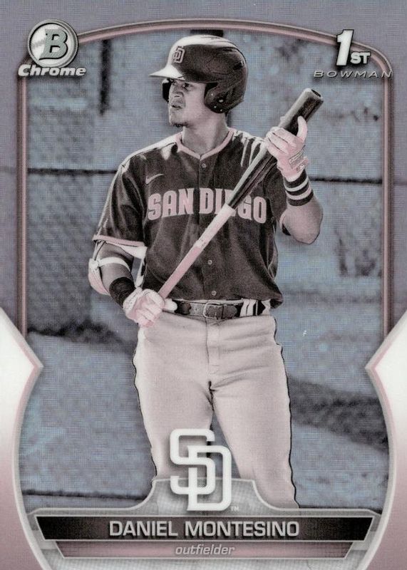 This card is 1 of 49 Daniel Montesino's card variations in the 2023 Bowman set being tracked by Sports Card Investor, including Chrome Prospects (1st), Chrome Prospects - Atomic Refractor (1st), Chrome Prospects - Lunar Glow Refractor (1st), Chrome Prospects - Refractor /499 (1st), and Chrome Prospects - Lava Refractor /399 (1st).
