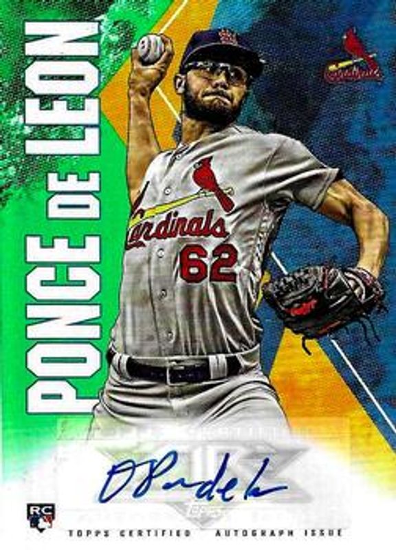 The Daniel Ponce De Leon 2019 Topps Fire #FA-DP Autographs - Green /75 Rookie card is 1 of 4 Daniel Ponce De Leon's card variations in the 2019 Topps Fire set being tracked by Sports Card Investor, including Autographs, Autographs - Magenta /25, and Autographs - Inferno /1.