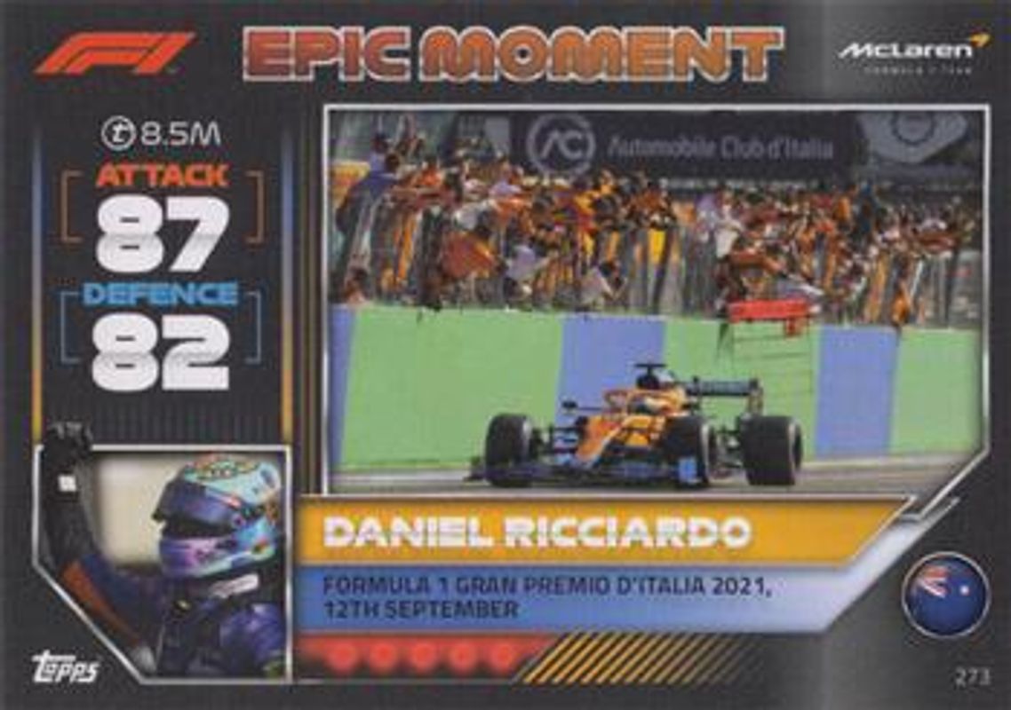 The Daniel Ricciardo 2022 Topps Turbo Attax Formula 1 #273 Base card is 1 of 36 Daniel Ricciardo's card variations in the 2022 Topps Turbo Attax Formula 1 set being tracked by Sports Card Investor, including #220 Base, #253 Base, #294 Base, #45 Base, and #44 Base.