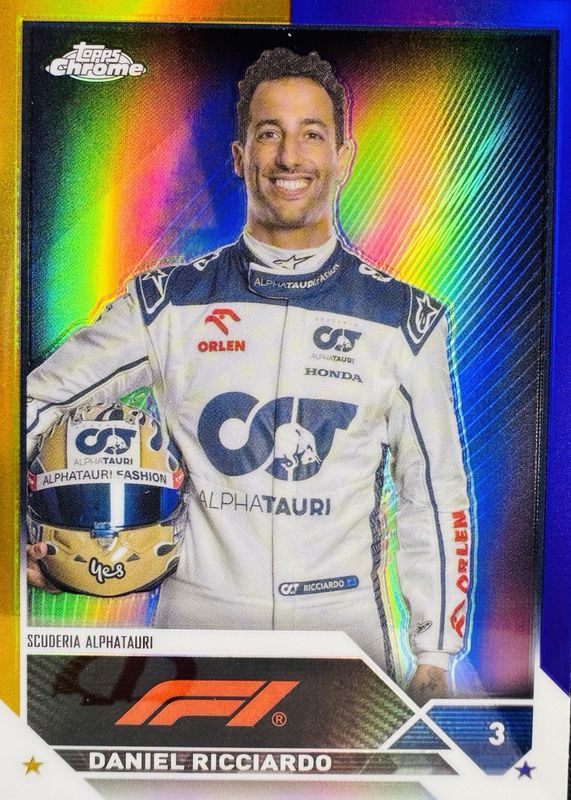 This card is 1 of 29 Daniel Ricciardo's card variations in the 2023 Topps Chrome Formula 1 set being tracked by Sports Card Investor, including Checker Flag Refractor, Orange & Red Refractor, Purple & Green Refractor, Red & Green Refractor, and Refractor.