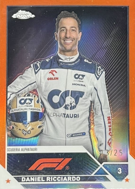 This card is 1 of 29 Daniel Ricciardo's card variations in the 2023 Topps Chrome Formula 1 set being tracked by Sports Card Investor, including Checker Flag Refractor, Gold & Purple Refractor, Orange & Red Refractor, Purple & Green Refractor, and Red & Green Refractor.