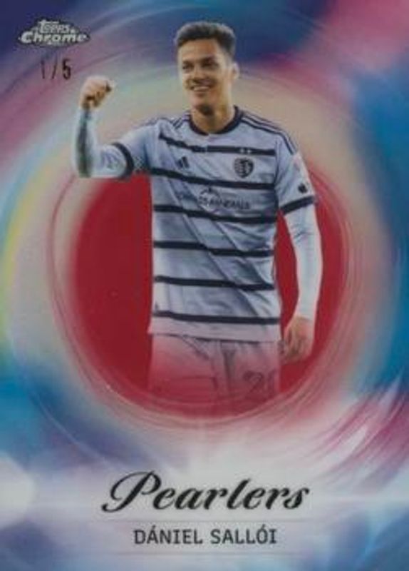 The Daniel Salloi 2023 Topps Chrome MLS #P-31 Pearlers - Red Refractor /5 card is 1 of 27 Daniel Salloi's card variations in the 2023 Topps Chrome MLS set being tracked by Sports Card Investor, including Base, Pink X-Fractor, Refractor, Speckle Refractor, and Blue Mini-Diamond Refractor /199.