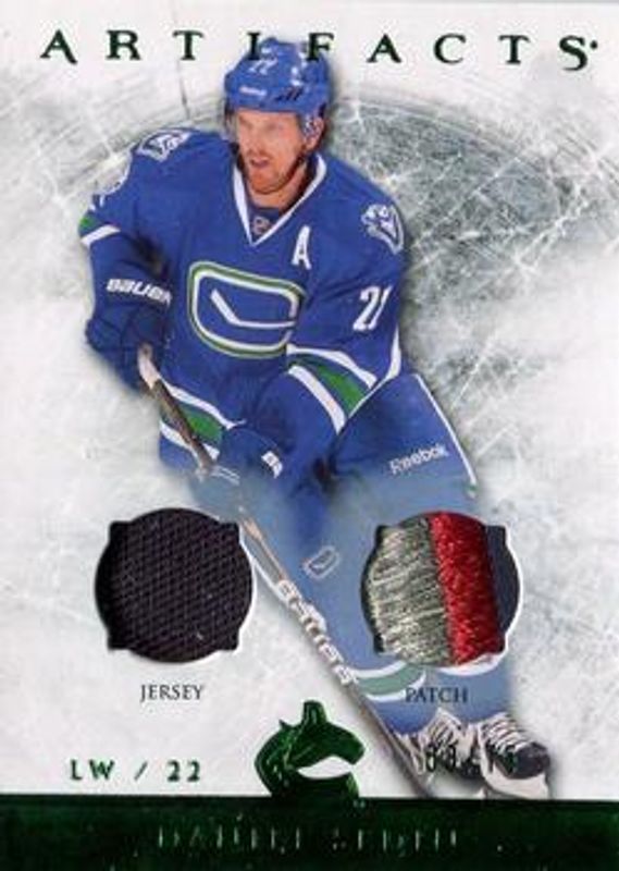 The Daniel Sedin 2012 Upper Deck Artifacts #16 Jersey Patch - Emerald /75 card is 1 of 16 Daniel Sedin's card variations in the 2012 Upper Deck Artifacts set being tracked by Sports Card Investor, including Base /699, Emerald /99, Sapphire /85, Gold Spectrum /25, and Black /5.