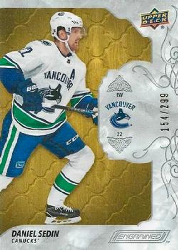 The Daniel Sedin 2019 Upper Deck Engrained #37 Base /299 card is 1 of 10 Daniel Sedin's card variations in the 2019 Upper Deck Engrained set being tracked by Sports Card Investor, including Ebony /49, Mahogany /10, Rosewood /1, Carved in Time, and Carved in Time Signatures.