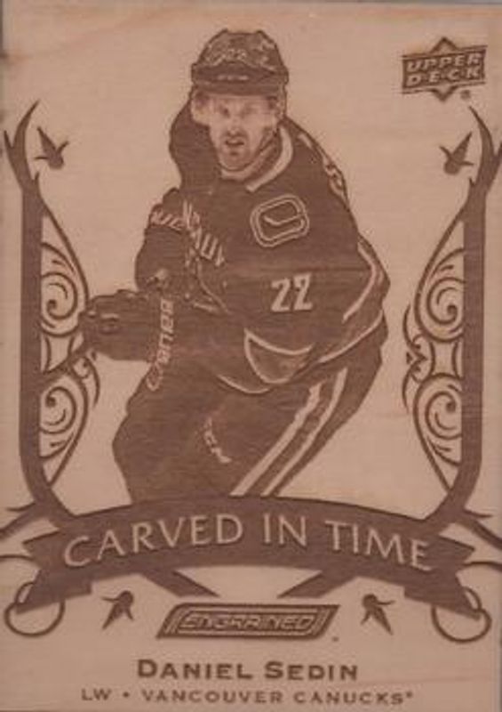The Daniel Sedin 2019 Upper Deck Engrained #CT-2 Carved in Time card is 1 of 10 Daniel Sedin's card variations in the 2019 Upper Deck Engrained set being tracked by Sports Card Investor, including Base /299, Ebony /49, Mahogany /10, Rosewood /1, and Carved in Time Signatures.