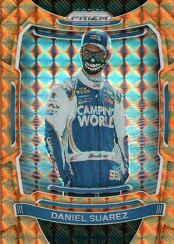 The Daniel Suarez 2021 Prizm NASCAR #19 Reactive Orange card is 1 of 72 Daniel Suarez's card variations in the 2021 Prizm NASCAR set being tracked by Sports Card Investor, including #66 Base, #19 Base, #66 Blue, #19 Blue, and #19 Hyper Blue & Carolina Blue.