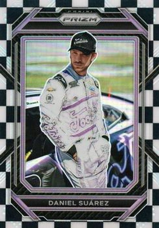 The Daniel Suarez 2023 Prizm NASCAR #17 Checkered Flag /50 card is 1 of 50 Daniel Suarez's card variations in the 2023 Prizm NASCAR set being tracked by Sports Card Investor, including Base, Hyper Blue & Carolina Blue, Hyper Purple & Yellow, Reactive Orange, and Red.