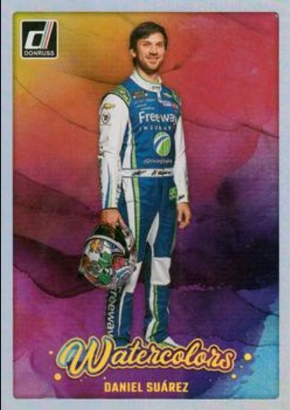 The Daniel Suarez 2024 Donruss NASCAR #8 Watercolors card is 1 of 56 Daniel Suarez's card variations in the 2024 Donruss NASCAR set being tracked by Sports Card Investor, including #60a Base, #60b Base, #60 Optic, #60 Optic Black Pandora, and #60 Optic Blue Velocity.