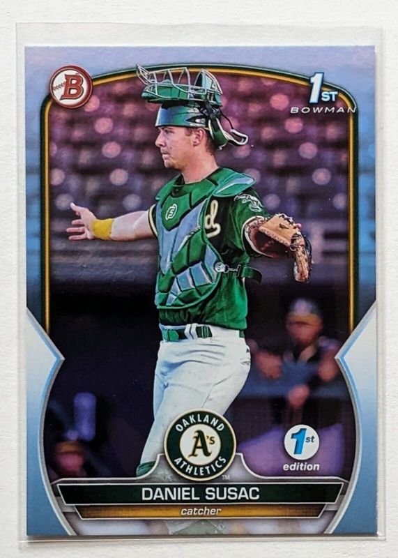 The Daniel Susac 2023 Bowman 1st Edition #BPPF-5 Sky Blue Foil card is 1 of 9 Daniel Susac's card variations in the 2023 Bowman 1st Edition set being tracked by Sports Card Investor, including Base, Blue Foil /150, Yellow Foil /75, Gold Foil /50, and Orange Foil /25.