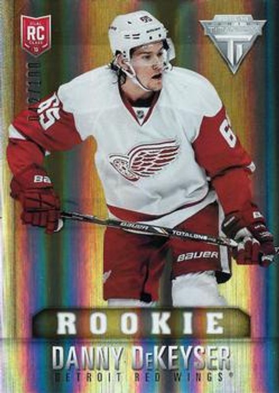 The Danny DeKeyser 2013 Titanium #120 Hobby Draft Position /20 Rookie card is 1 of 17 Danny DeKeyser's card variations in the 2013 Titanium set being tracked by Sports Card Investor, including Base /91, Commons Retail /299, Commons Retail Red /99, Commons Retail Gold /10, and Printing Plates Black /1.