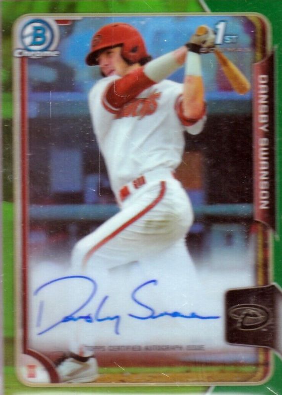 The Dansby Swanson 2015 Bowman Draft #BCA-DS Chrome DP Auto - Green Refractor /99 (1st) card in Raw condition has not changed in price in the last 30 days and was last sold for $120.00 .