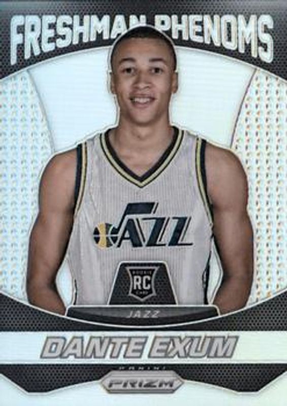 The Dante Exum 2014 Prizm #5 Freshman Phenoms Rookie card is 1 of 42 Dante Exum's card variations in the 2014 Prizm set being tracked by Sports Card Investor, including Base, Blue Green Mosaic, Blue Mojo, Blue Wave, and Green.