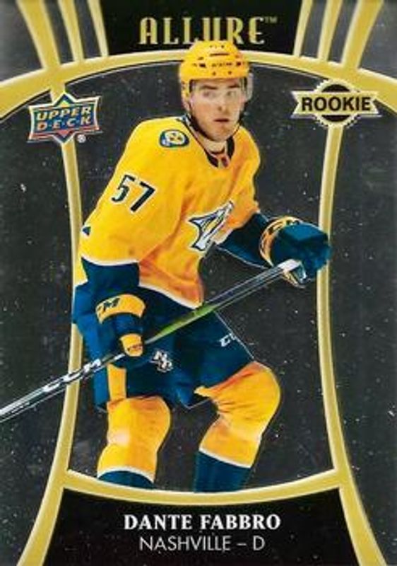 The Dante Fabbro 2019 Upper Deck Allure #115 Base Rookie card is 1 of 42 Dante Fabbro's card variations in the 2019 Upper Deck Allure set being tracked by Sports Card Investor, including Base, Pewter, Pink Diamond, Red Rainbow, and White Rainbow.