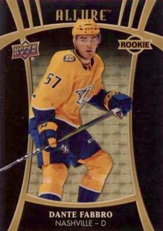 The Dante Fabbro 2019 Upper Deck Allure #115 Elysium Black /3 Rookie card is 1 of 42 Dante Fabbro's card variations in the 2019 Upper Deck Allure set being tracked by Sports Card Investor, including #115 Base, #78 Base, #78 Pewter, #115 Pink Diamond, and #78 Red Rainbow.