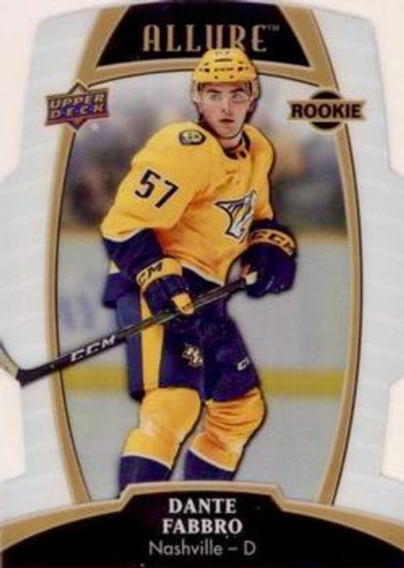 The Dante Fabbro 2019 Upper Deck Allure #78 White Rainbow Rookie card is 1 of 42 Dante Fabbro's card variations in the 2019 Upper Deck Allure set being tracked by Sports Card Investor, including #115 Base, #78 Base, #78 Pewter, #115 Pink Diamond, and #78 Red Rainbow.