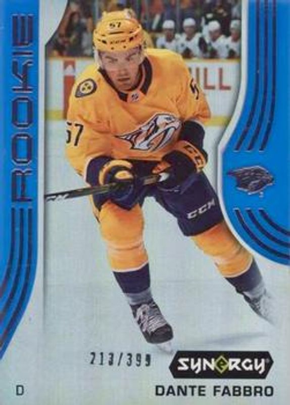 The Dante Fabbro 2019 Upper Deck Synergy #78 Blue /799 Rookie card is 1 of 14 Dante Fabbro's card variations in the 2019 Upper Deck Synergy set being tracked by Sports Card Investor, including Base /19, Red, Red Bounty, Green /299, and Purple /7.