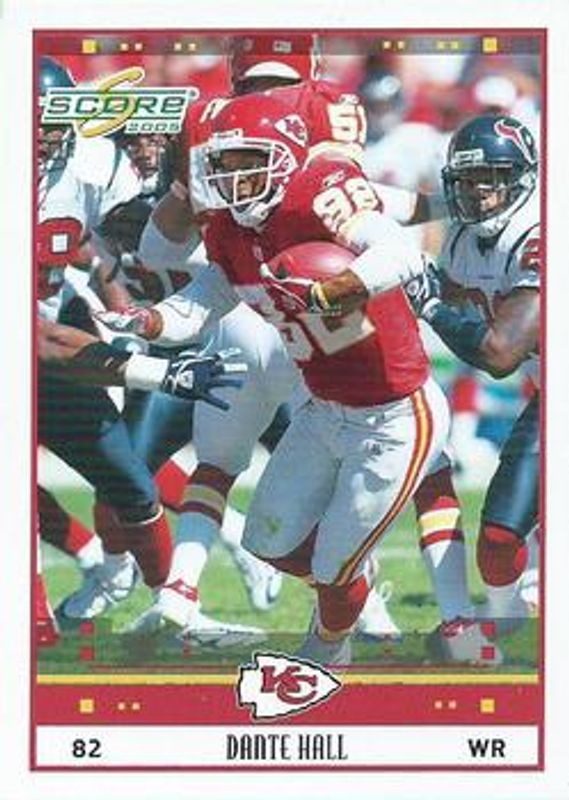 The Dante Hall 2005 Score #136 Base card is 1 of 6 Dante Hall's card variations in the 2005 Score set being tracked by Sports Card Investor, including Glossy, Scorecard /599, Adrenaline /399, Revolution /199, and Final Score /17.