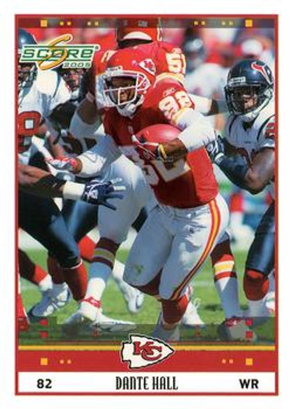 The Dante Hall 2005 Score #136 Glossy card is 1 of 6 Dante Hall's card variations in the 2005 Score set being tracked by Sports Card Investor, including Base, Scorecard /599, Adrenaline /399, Revolution /199, and Final Score /17.