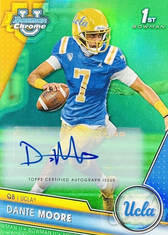 This card is 1 of 21 Dante Moore's card variations in the 2023 Bowman Chrome University set being tracked by Sports Card Investor, including Prospect Auto (1st), Prospect Auto - Refractor /499 (1st), Prospect Auto - Fuchsia Mini-Diamond Refractor /150 (1st), The Big Kahuna Autographs /150, and 1955 Bowman Football Autographs /99.
