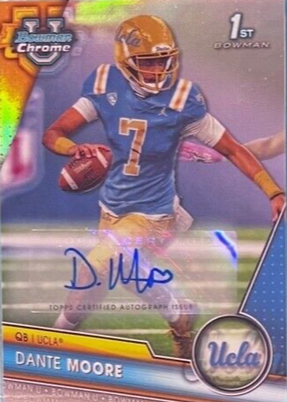 The Dante Moore 2023 Bowman Chrome University #133 Prospect Auto - Refractor /499 (1st) card in Raw condition has moved up $13.00 (+22.8%) in the last 30 days and was last sold for $70.00 .