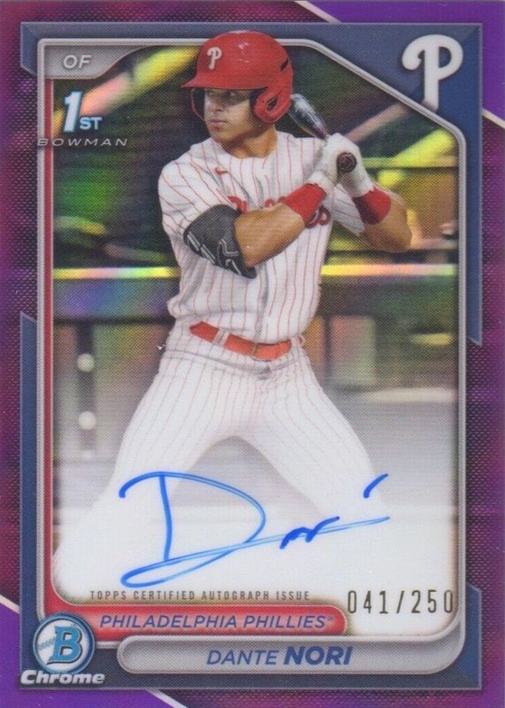 The Dante Nori 2024 Bowman Draft #CPA-DN Chrome DP Auto - Purple Refractor /250 (1st) card in Raw condition has moved down -$18.31 (-36.6%) in the last 30 days and was last sold for $31.69 .