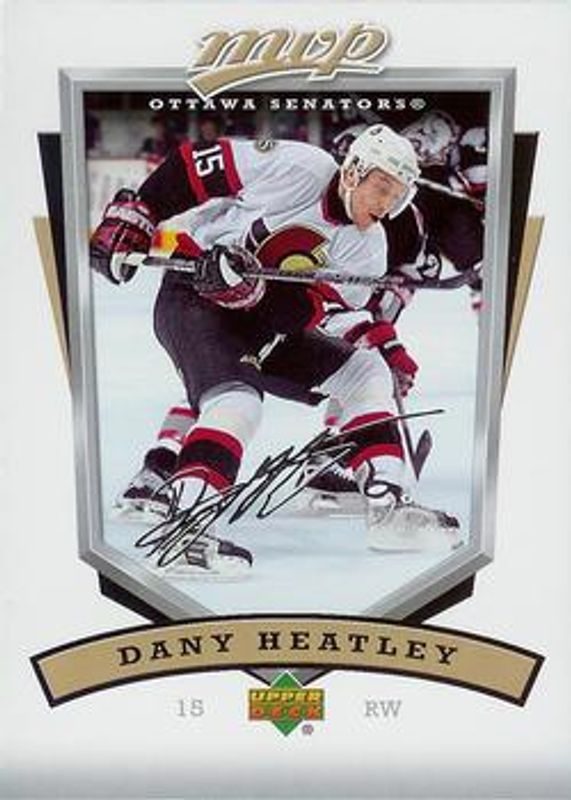 The Dany Heatley 2006 Upper Deck MVP #207 Base card is 1 of 7 Dany Heatley's card variations in the 2006 Upper Deck MVP set being tracked by Sports Card Investor, including Gold Scripts /100, Super Scripts /25, Clutch Performers, Gotta Have Hart, and One on One Autographs.