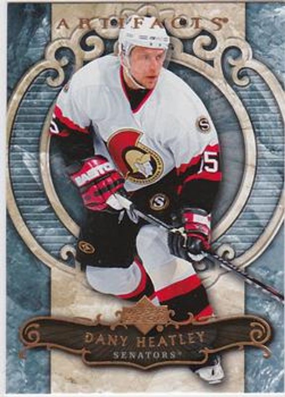 The Dany Heatley 2007 Upper Deck Artifacts #11 Base /599 card is 1 of 24 Dany Heatley's card variations in the 2007 Upper Deck Artifacts set being tracked by Sports Card Investor, including #124 Base /599, #124 Silver /100, #11 Silver /100, #124 Gold /50, and #11 Gold /50.