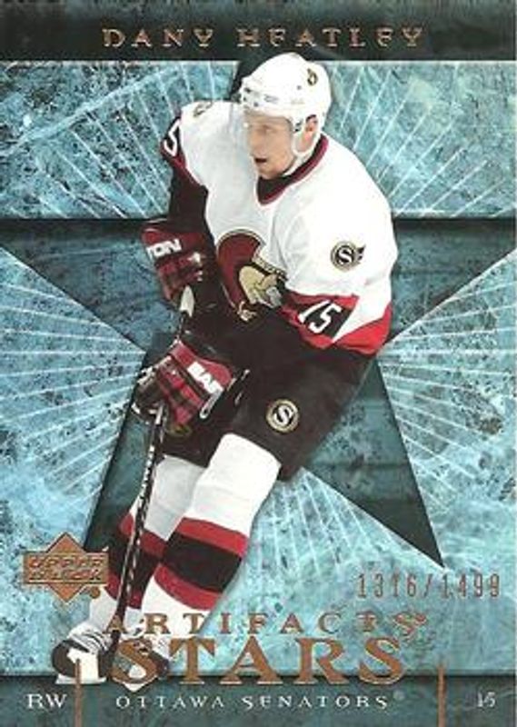 The Dany Heatley 2007 Upper Deck Artifacts #124 Base /599 card is 1 of 24 Dany Heatley's card variations in the 2007 Upper Deck Artifacts set being tracked by Sports Card Investor, including #11 Base /599, #124 Silver /100, #11 Silver /100, #124 Gold /50, and #11 Gold /50.