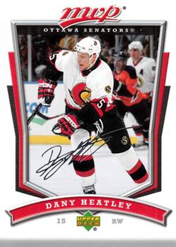 The Dany Heatley 2007 Upper Deck MVP #251 Base card is 1 of 4 Dany Heatley's card variations in the 2007 Upper Deck MVP set being tracked by Sports Card Investor, including Gold Scripts /100, Super Scripts /25, and Hart Candidates.