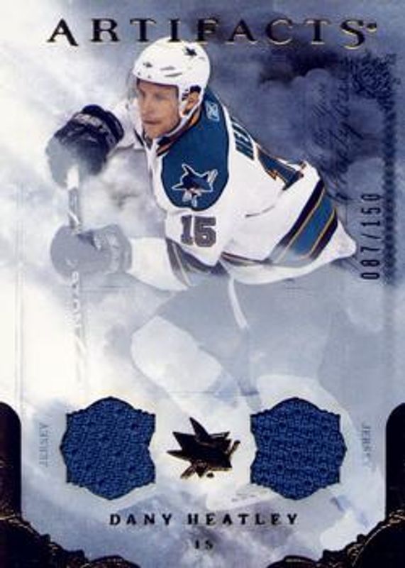 The Dany Heatley 2010 Upper Deck Artifacts #72 Jerseys Bronze /150 card is 1 of 22 Dany Heatley's card variations in the 2010 Upper Deck Artifacts set being tracked by Sports Card Investor, including Base /699, Emerald /50, Gold /35, Silver /25, and Rainbow /10.